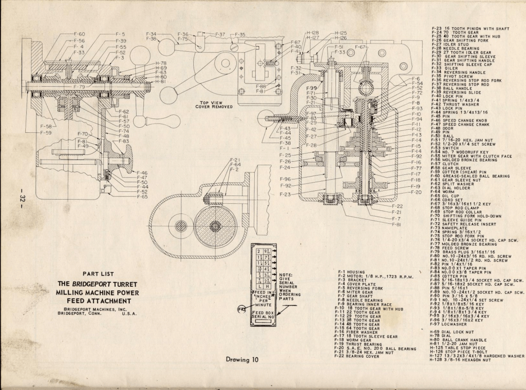 My old (1964-ish) power feed box on my Bridgeport mill had a couple of gears with broken teeth. I took apart the power feed gear box to fix these teeth. Here are some photos I took during the re-assembly. First up — the main case….